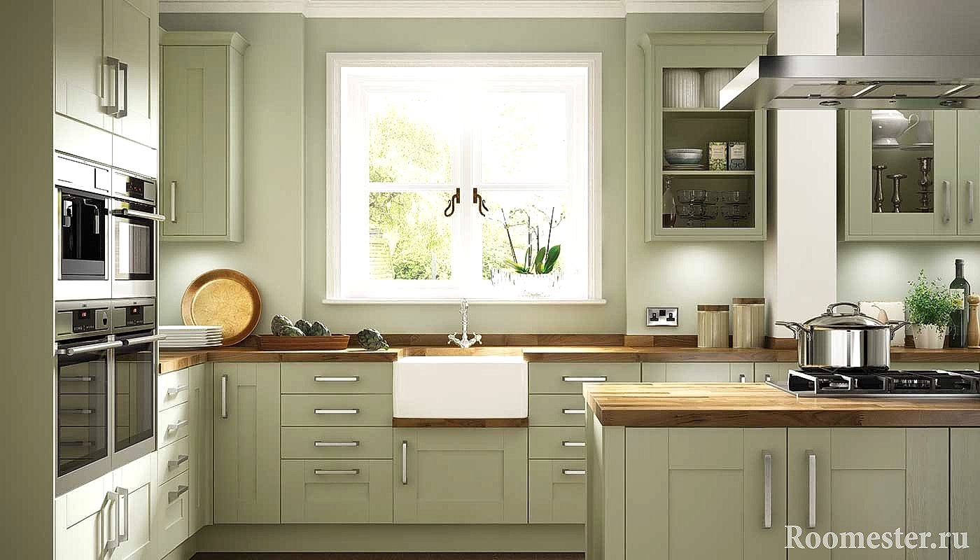 Une option intéressante est le mobilier vert olive clair. L'absence de tout contraste avec l'intérieur environnant contribue au confort et à l'efficacité d'une personne. Les propriétés apaisantes sont utilisées avec succès dans la cuisine, où un environnement agressif nécessite un certain équilibre pour la psyché.