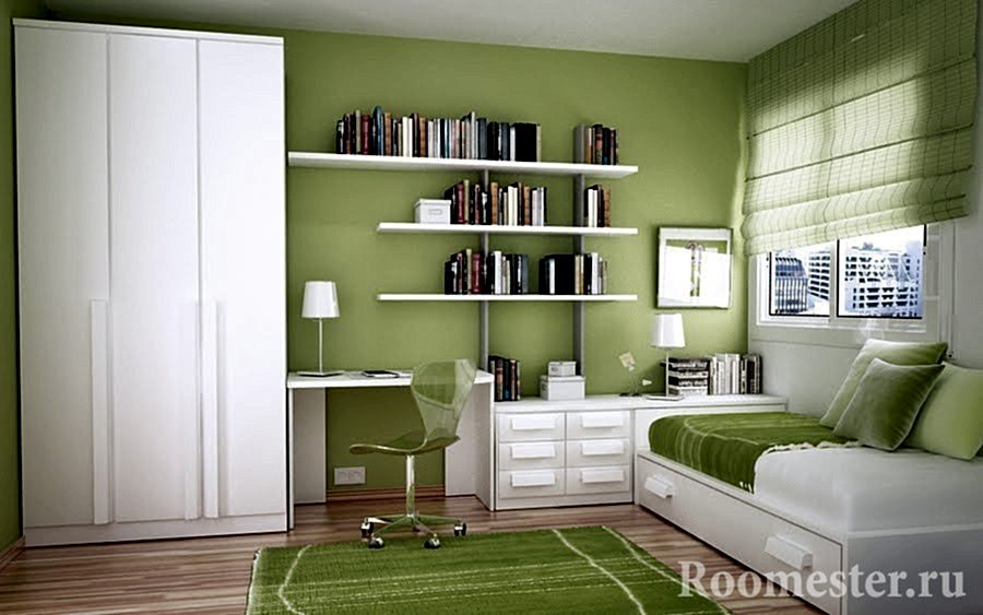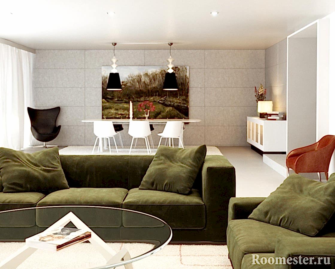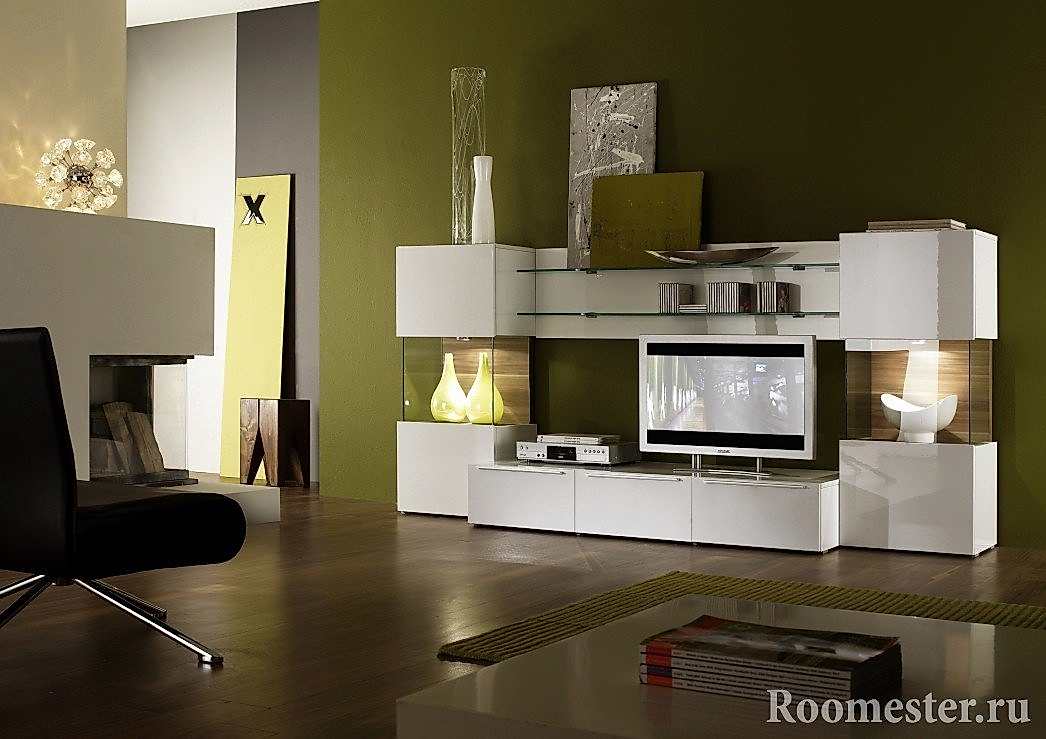 Combinaison avec la couleur blanche. L'harmonie magique est possible avec des tons d'olive délicats. Les deux couleurs souligneront tous les mérites l'une de l'autre, si elles sont mélangées dans des proportions égales. C'est l'utilisation uniforme qui est le code gagnant pour mettre l'accent sur le décor. Pour démontrer clairement un échantillon réussi de la palette, nous pouvons donner l'exemple suivant. Les concepteurs combinent des murs olive avec un léger dégradé avec un sol blanc brillant. Dans le même temps, les professionnels peuvent faire une insertion soignée de tons rouges. Avec son utilisation, il faut être extrêmement scrupuleux, car le rouge est l'opposé par essence du vert. Un tel décor blanc-olive aura fière allure dans n'importe quelle pièce de la maison.