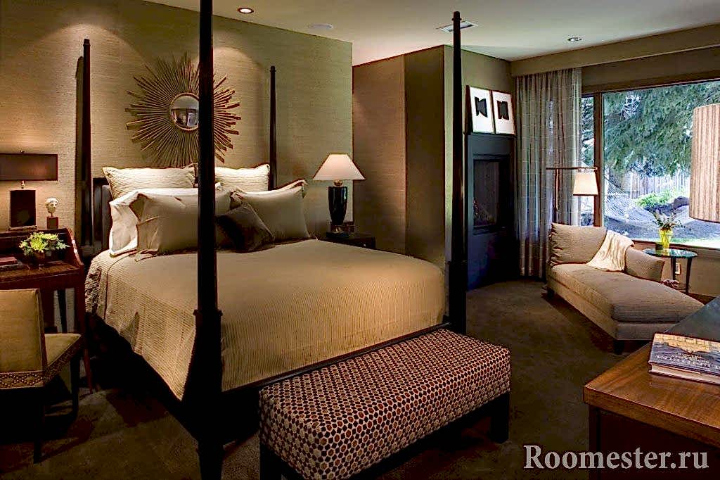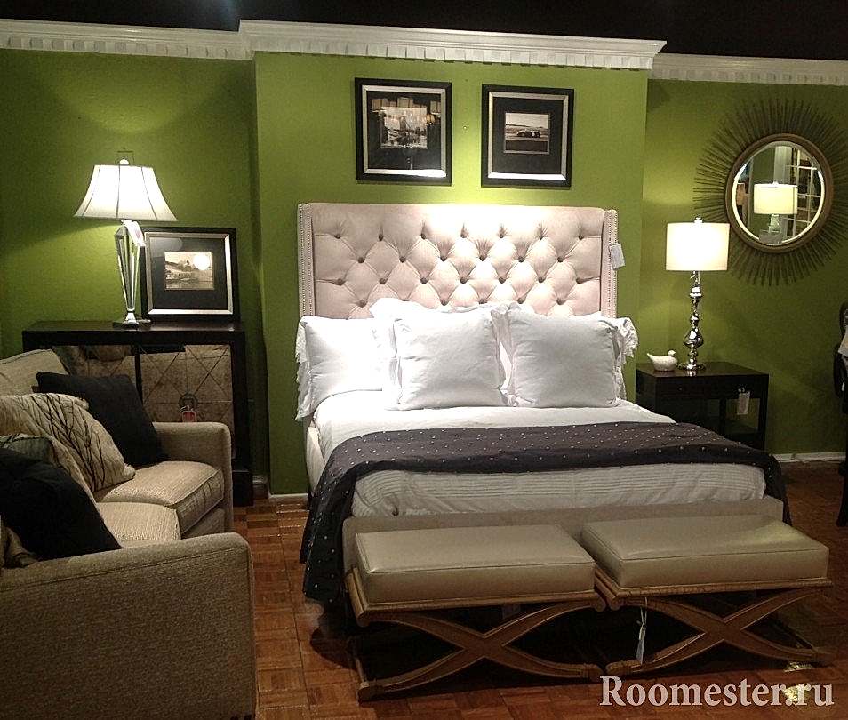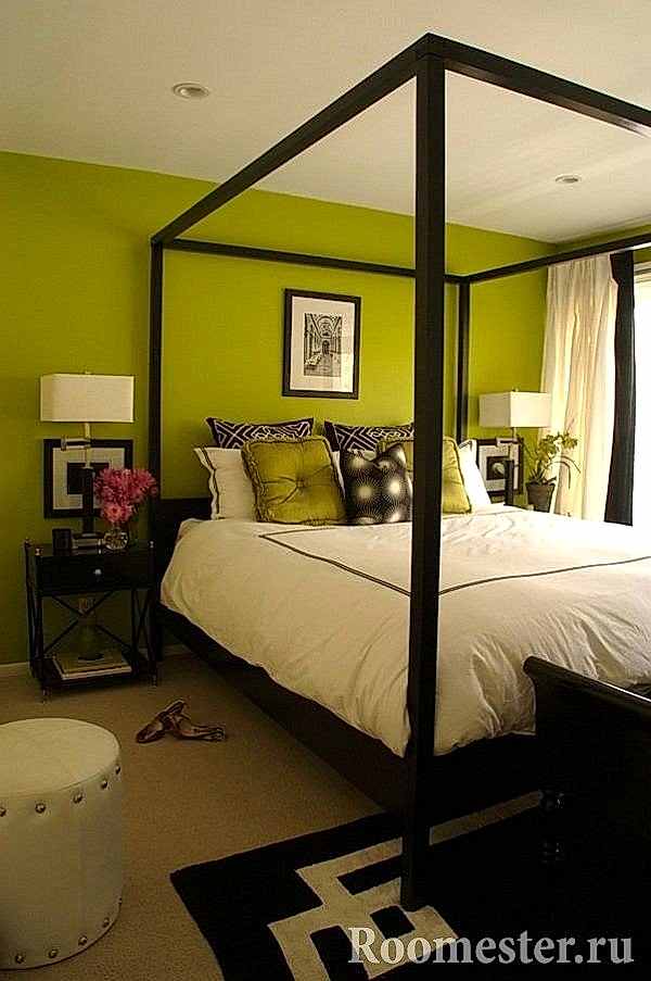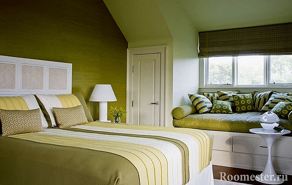 Lors de la décoration de l'intérieur de cette pièce, vous devez également éviter les accents de couleurs vives, car la chambre est conçue pour des vacances reposantes. Vous ne pouvez compléter le décor olive qu'avec de petits accessoires de teintes moutarde. Le reste utilise un gamma olive clair sans éclats lumineux. L'insert à lait sera intéressant. Elle euthanasie avec autant de succès qu'un verre de lait chaud la nuit. Un décor inhabituel peut être dilué avec un abat-jour de couleur brique ou un tapis oriental en laine.