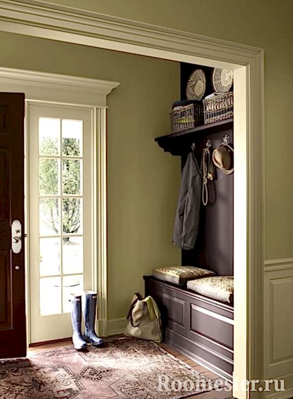 Et ici, personne ne doute de la pertinence de la couleur en question. L'essentiel est de ne pas oublier que le couloir n'est pas toujours riche en lumière, ce qui suggère un ton plus lumineux pour l'hôte. L'utilisation de stuc vénitien de couleur olive est encouragée. Son éclat lorsqu'il est exposé à la lumière semblera du marbre, et les murs acquerront un aspect respectable.Le revêtement de sol peut également être réalisé dans des tons olive. Cette couleur cache bien la saleté, ce qui élimine la nécessité pour le propriétaire de courir avec un chiffon à chaque fois.