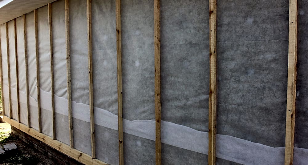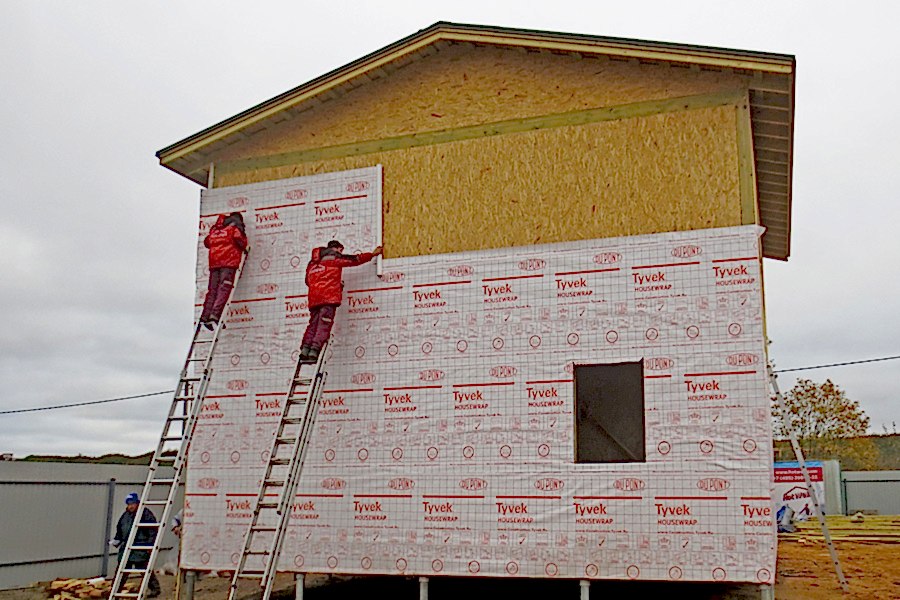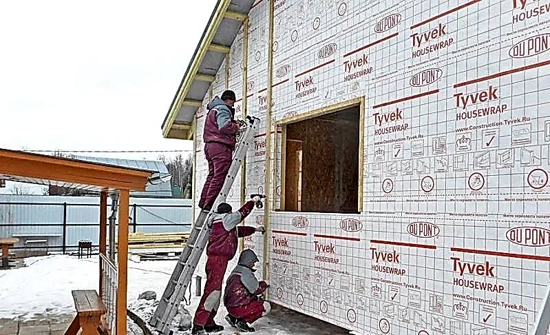 Le film de protection contre l'humidité du vent élimine non seulement la vapeur, mais protège également l'isolation thermique de l'humidité des rues. Pour le travail, vous pouvez utiliser Izospan A, d'autres matériaux aux propriétés similaires. Les toiles commencent à être fixées à partir du sol, posées horizontalement. Chaque couche suivante se chevauche, c'est-à-dire qu'elle recouvre de sa partie inférieure le haut de la précédente.