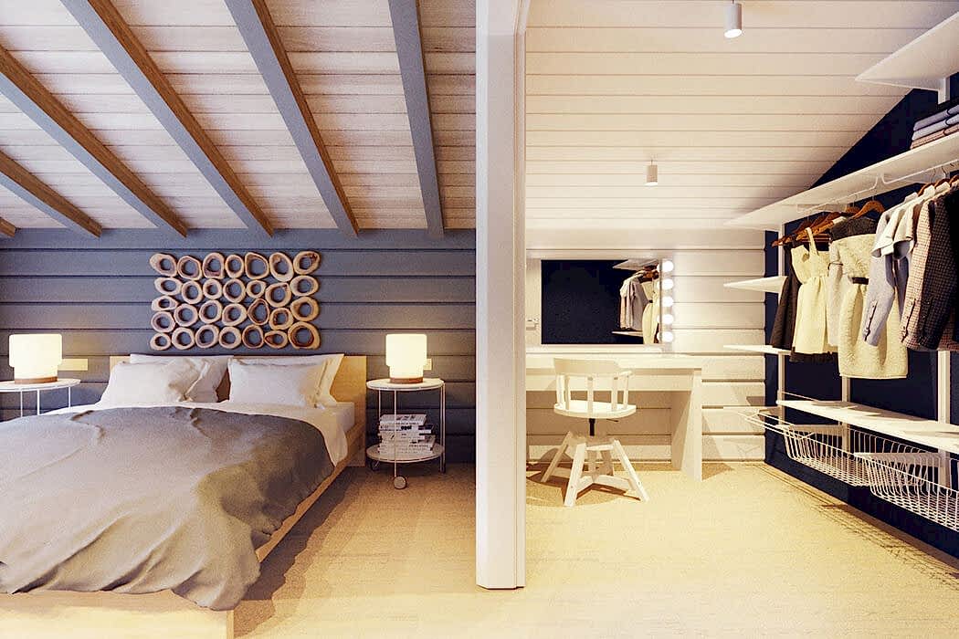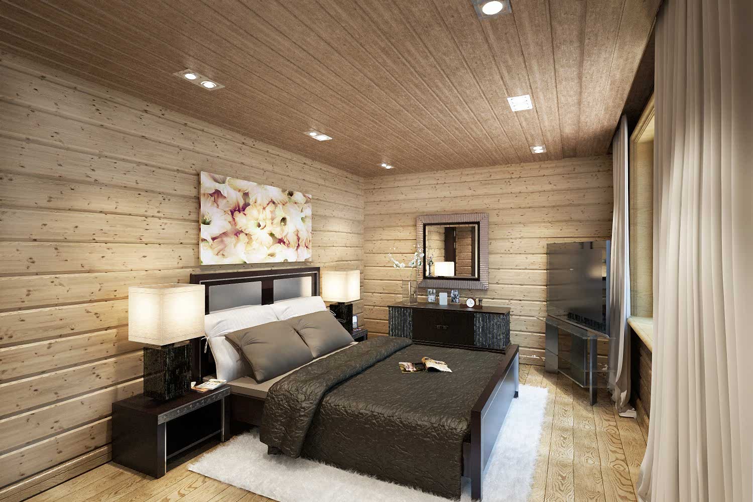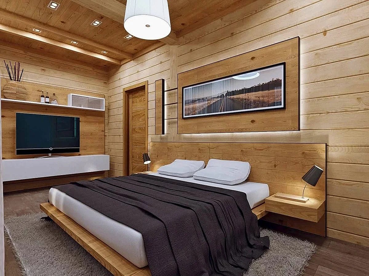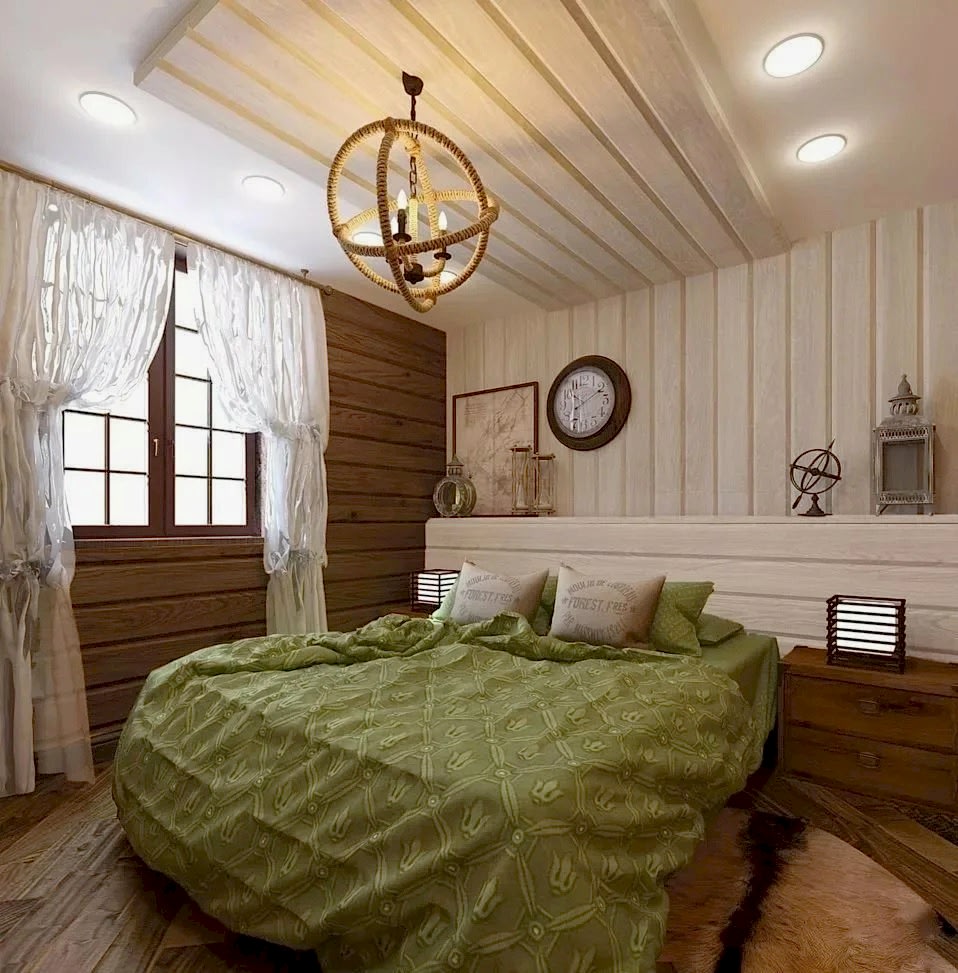Les panneaux blanchis et vieillis de chêne, de frêne, de pin conviennent aux styles rustiques et autres styles ethniques. Pour le style loft, il suffit de décorer uniquement le plafond avec des lamelles ou de dessiner une certaine zone. Le style chalet convient à une résidence de campagne. Assurez-vous d'avoir des peaux d'animaux sur le sol et les murs. La haute technologie implique l'utilisation de matériaux en bois uniquement en complément.