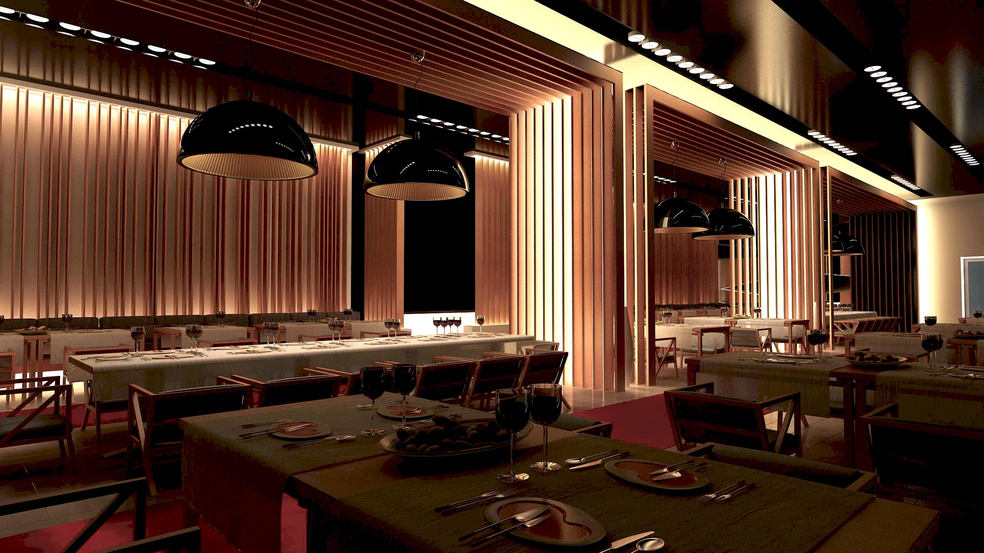 Le confort des visiteurs dépend de l'utilisation d'appareils d'éclairage et de la disposition de l'éclairage naturel. Le jour, vous ne devez pas laisser les rideaux fermés et passer à l'éclairage artificiel. Dans le même temps, une partie des dispositifs d'éclairage doit être allumée en permanence, principalement moins lumineuse. En plus de la fonction directe, c'est-à-dire d'assurer une visibilité normale, l'éclairage a un rôle dans la création d'un environnement lumineux et d'une gamme de couleurs. Le système de gradation vous permettra d'ajuster la lumière - afin de changer l'atmosphère dans la pièce. Les appareils d'éclairage sont assemblés dans des compositions spéciales pour décorer les coins du restaurant. Ces lieux sont idéaux pour les compétitions et les performances d'artistes. Dans les institutions à conception technologique, ils créent des effets d'éclairage, parfois ils utilisent des sources lumineuses non traditionnelles, par exemple des lampes au néon.